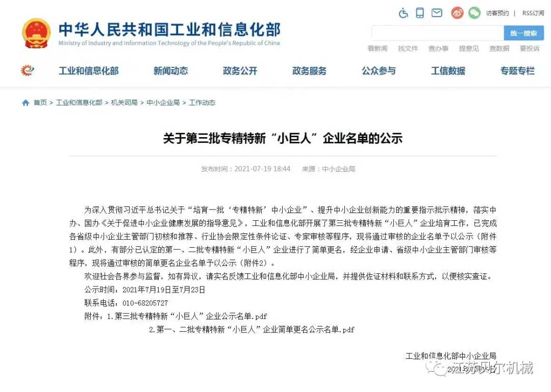2021年7月19日,中國工業(yè)和信息化部公示了第三批專精特新“小巨人”企業(yè)名單,江蘇貝爾機械有限公司成功上榜。